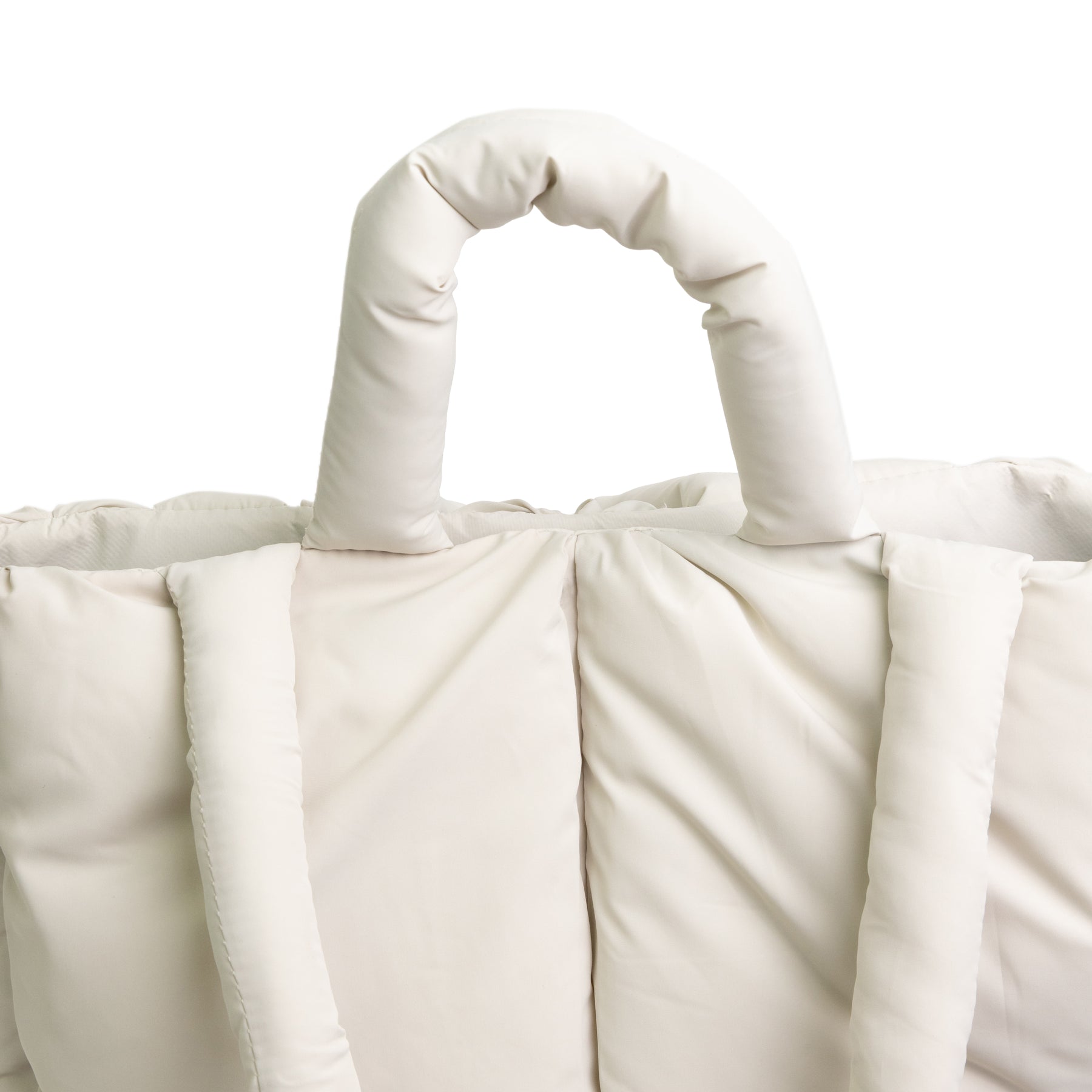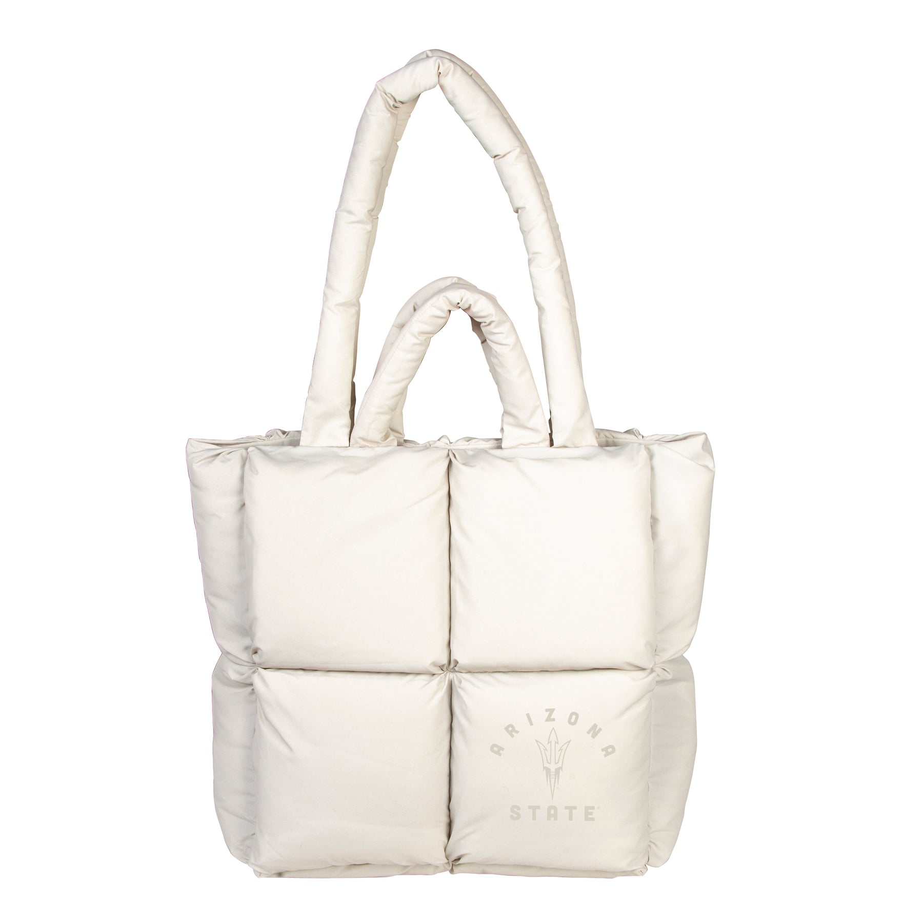 Elevate your style with our Puff Tote. Crafted to perfection, this tote seamlessly combines soft quilted detailing, and subtle team spirit with modern functionality. The neutral color allows you to show off your team spirit in an understated way, while the plush puff exterior offers a touch of comfort. Tailored for everyday use, the spacious interior easily accommodates your essentials. Stay organized on the move with two interior pockets and a zipper pocket. The versatile handles offer multiple carrying options – drape it over your shoulder or carry it by hand. The magnet button closure helps to keep your belongings secure. Whether you're off to the office or a weekend adventure, the Puff Tote is the perfect blend of fashion-forward design and practicality, making it an ideal companion for any occasion.