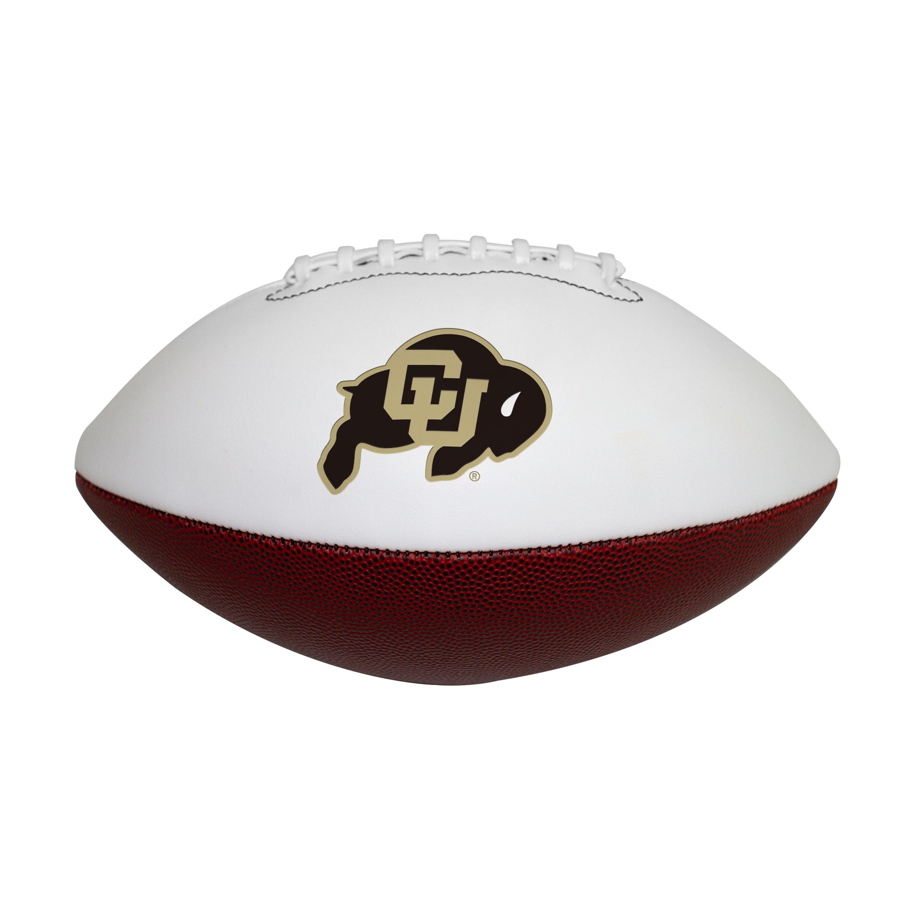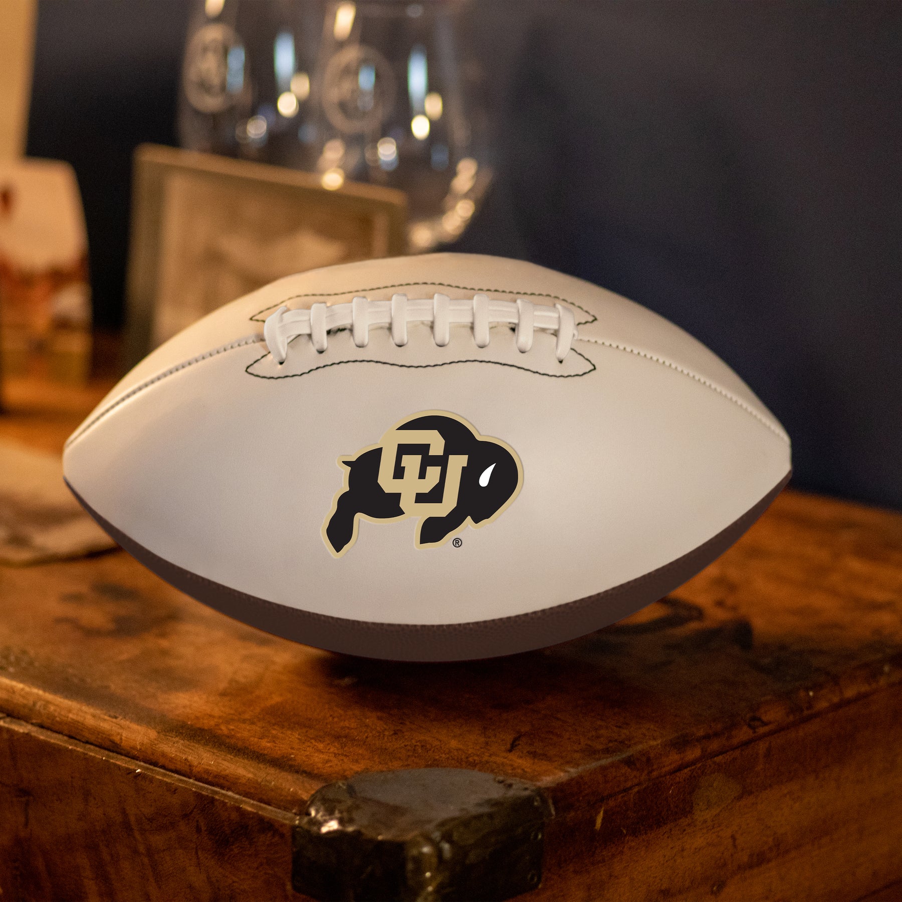 This officially licensed, high-quality autograph football is great for gifts, collectors, and home or office display. A brown pebble grain panel features a team wordmark in black. Two smooth white panels give ample room for signatures. The top smooth panel has a large heat-transferred team logo. Best if signed with a permanent marker and given time to dry to prevent smearing.