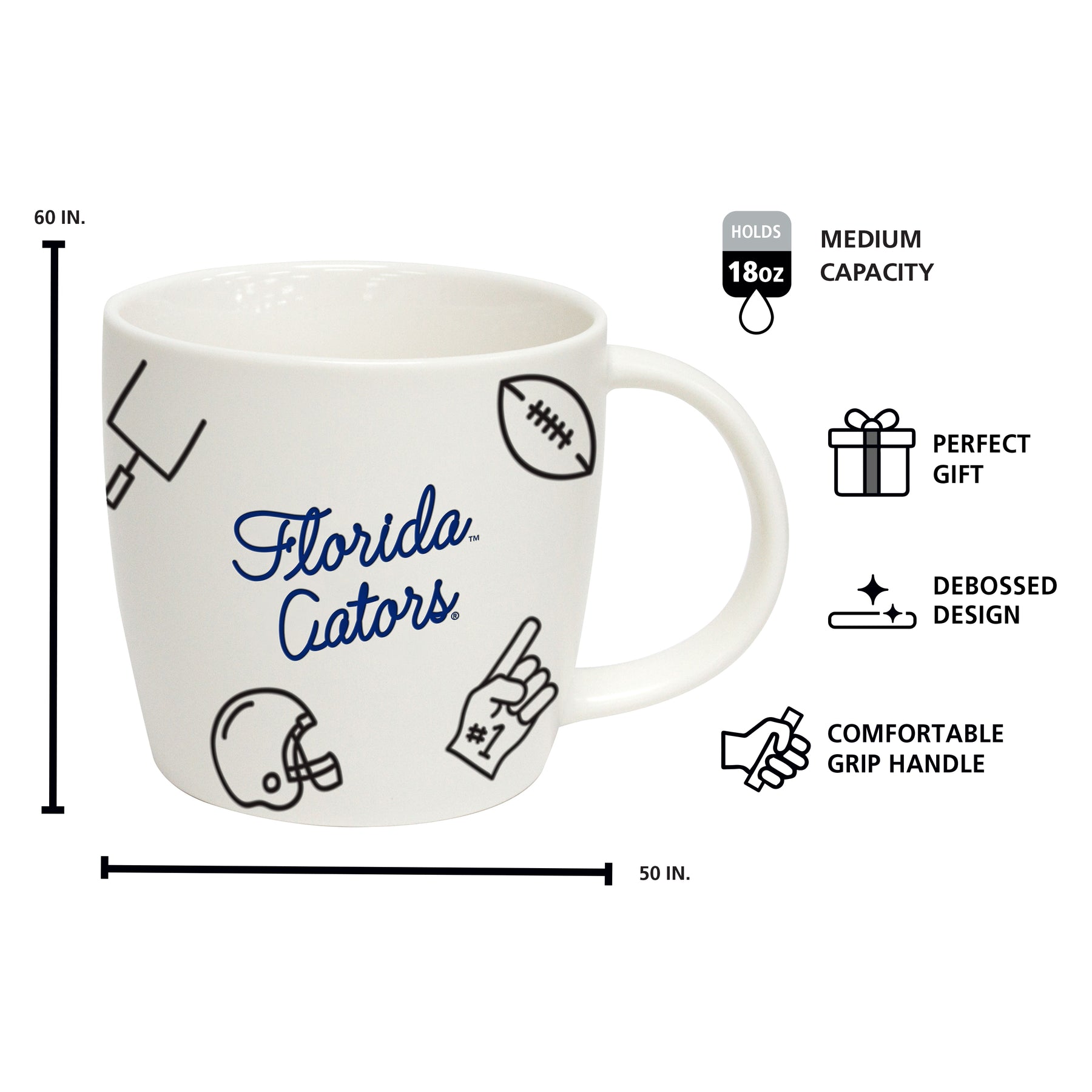 This iconic 18oz Playmaker Mug is one chic piece you'll want to display all year long. It features your team's primary color in a script font with an all-over debossed sport detailing on an ivory colored ceramic. The mug is perfect for sipping all season long. Whether sipping at work, home, or on-the-go, you can showcase your ultimate inner fan.