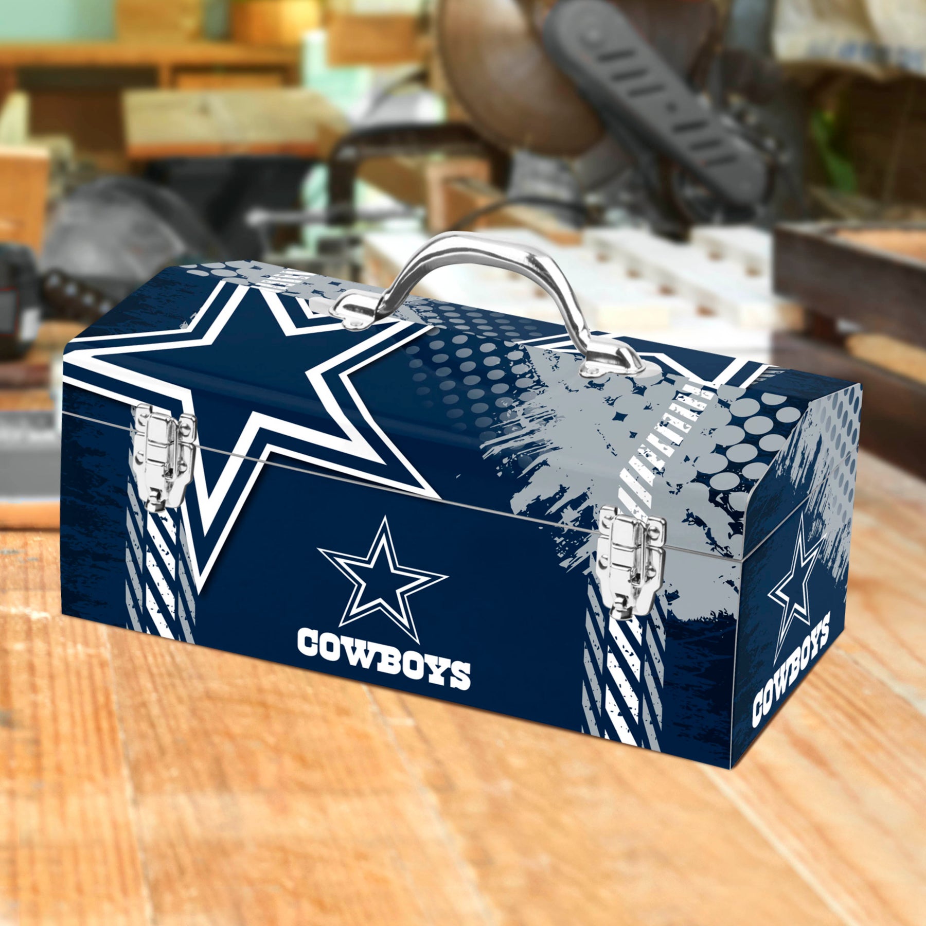 Full Print Tool Boxes are perfect for the handy fan! Measuring 16-inches wide and 7.5-inches tall and constructed of high-strength steel for that extra durability. This tool box looks great, decorated with bright and vibrant team colored graphics. This product also features dual latches that keep items secure and includes an inner tool tray perfect size for household tools to stay organized.