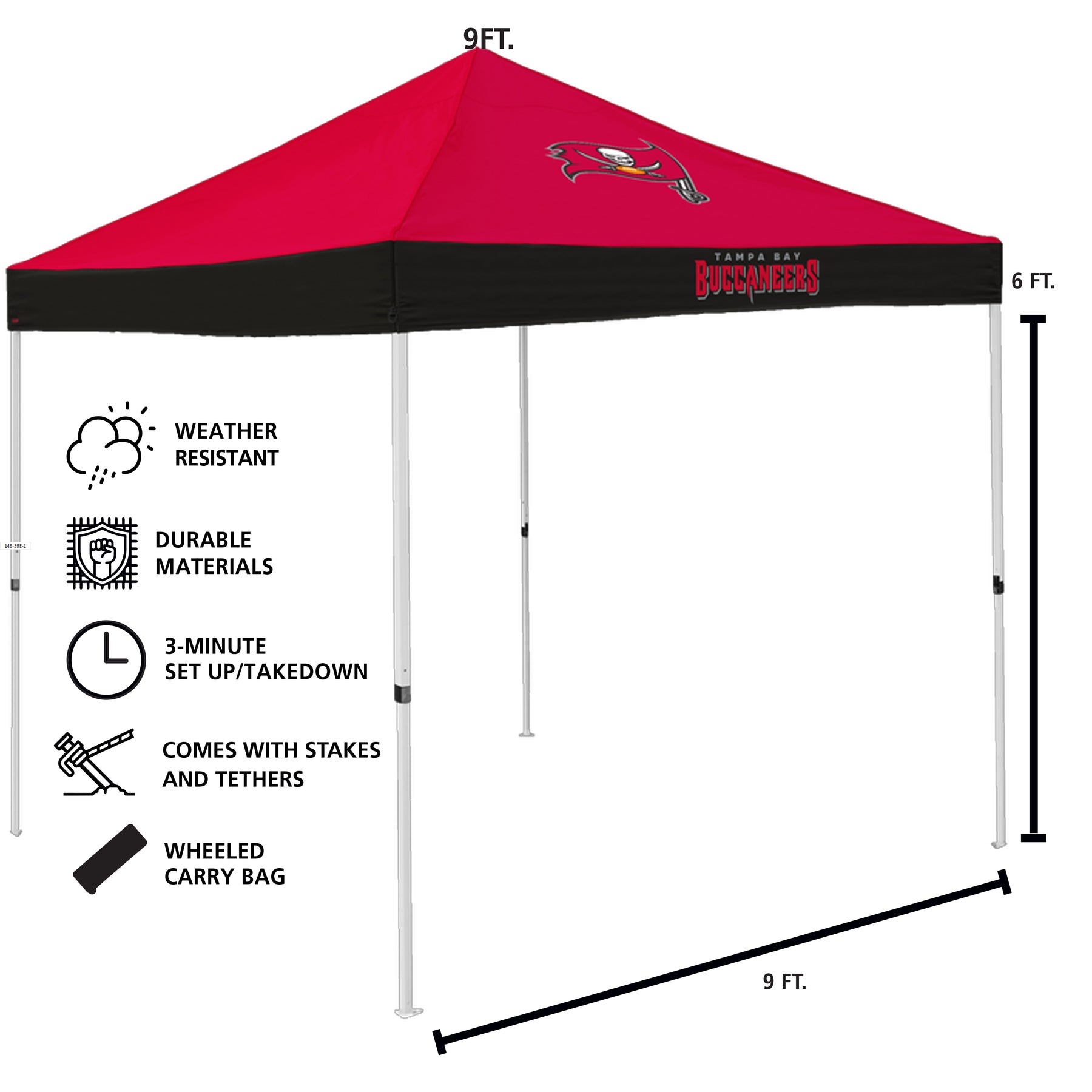 Show your colors on game day with the Economy Canopy tailgate tent. When set up it, measures 9 ft. x 9 ft., the size of a standard parking space. It is made of durable powder-coated steel and water-resistant polyester. The top and valances come in alternating team colors and feature two logos on alternating sides. It has a 6 ft. head clearance and stands 9 ft. at the tallest point. It has three height adjustment levels, and no-pinch, easy-to-push buttons. It takes about three minutes for two people to set up. It comes with a drawstring carrying bag, eight ties and eight stakes. It weighs 29 pounds. Weight bags are sold separately for use on concrete.